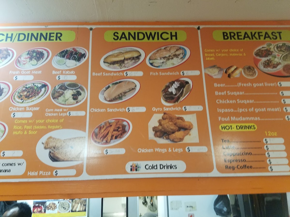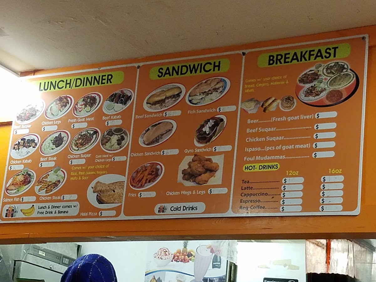 The lunch and dinner offerings are equally impressive, featuring a variety of dishes such as Beef Suqaar, Chicken Kabab, and savory Halal Pizza. Sandwich lovers can indulge in choices like the Beef, Chicken, and Fish Sandwiches, while the crunchy Fries serve as a perfect side. Customers rave about the warm atmosphere and friendly service, making each visit a memorable experience.